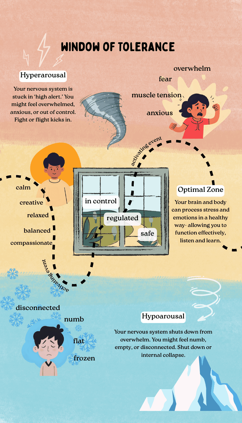 Ever feel like you’re either on edge or completely checked out? That’s your nervous system telling you you’re outside your Window of Tolerance—the zone where you feel most calm, clear, and in control. When you’re in your window, you can think clearly, connect with others, and handle stress without feeling overwhelmed or shut down.
